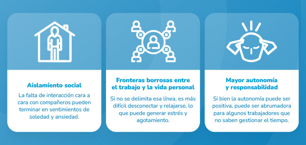 Con la creciente adopción del teletrabajo en el actual panorama laboral, se ha producido un cambio en la dinámica laboral, lo que podría tener un impacto en la salud mental de los empleados. A medida que más personas han adoptado el trabajo desde casa, hemos observado tanto sus ventajas como los desafíos asociados a esta modalidad. Algunos de estos desafíos incluyen: