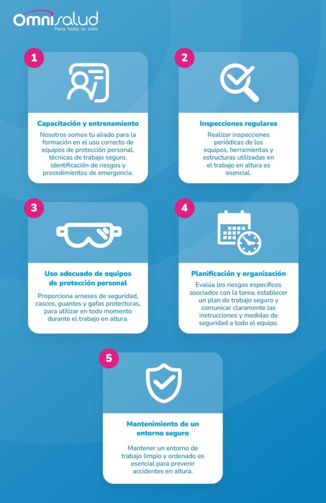 En Omnisalud también recomendamos inspeccionar regularmente las estructuras y las superficies de trabajo para identificar posibles riesgos de caídas, como superficies resbaladizas o puntos de anclaje dañados.